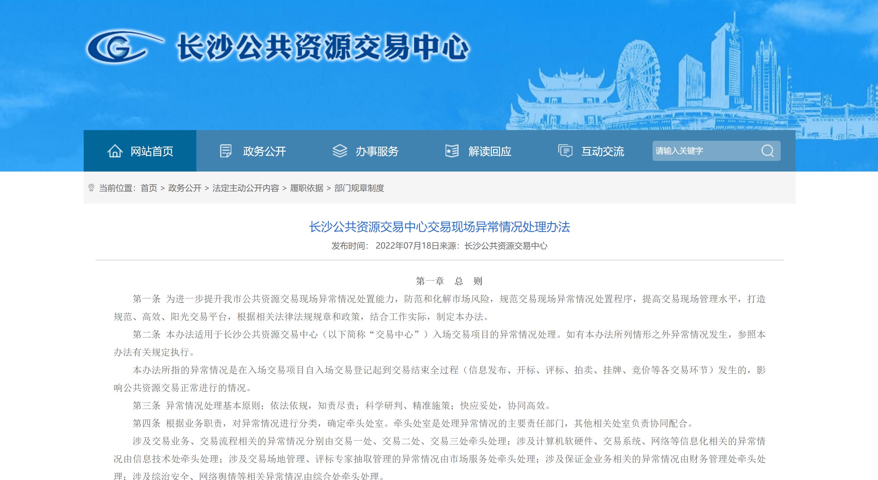 近(jìn)日(rì),長(cháng)沙&α•∑公共資源交易中心出台了(le)《交易現(xiàn)場(chǎng)•± 異常情況處理(lǐ)辦法》(以下(xià)簡稱《辦法》) ☆,對(duì)入場(chǎng)交易項目全過程中∑發生(shēng)的(de)異常情況處理(lǐ)作♣§(zuò)出規定。