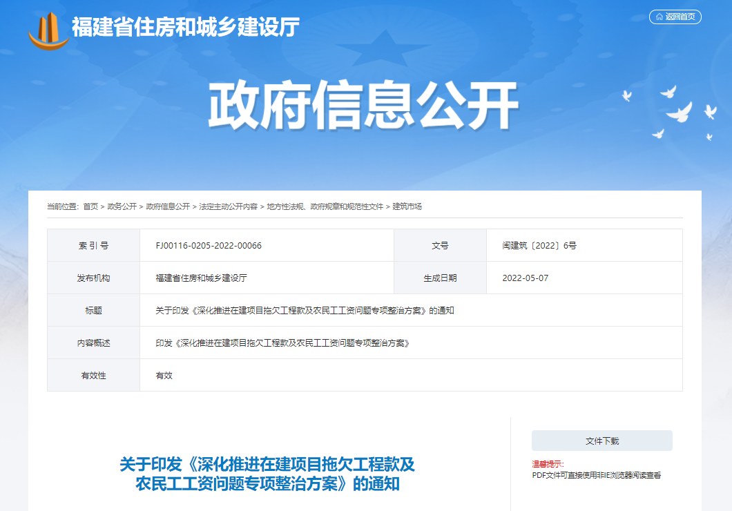 近(jìn)日(rì),福建省住建廳發布了(le)關于印發《深©化(huà)推進在建項目拖欠工(gōng)程款及農(nóng)民(mín)工(∑≠gōng)工(gōng)資問(wèn)題專項整治方案》的(♥♠de)通(tōng)知(zhī)。