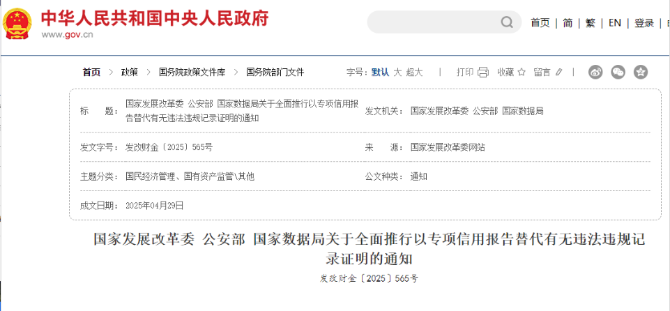 國(guó)家(jiā)發展改革委 公安部 國(guó)家(jiā)數(sφ✔>hù)據局關于全面推行(xíng)以專項信用 ∞€©(yòng)報(bào)告替代有(yǒu)無違法違規記錄★•證明(míng)的(de)通(tōng)知(zh™↓πλī) 發改财金(jīn)〔2025〕565号 各省、自(z™α÷ì)治區(qū)、直轄市(shì)、新疆生(shēng)産建設兵(bī©≠★βng)團社會(huì)信用(yòng)體(tǐ)...